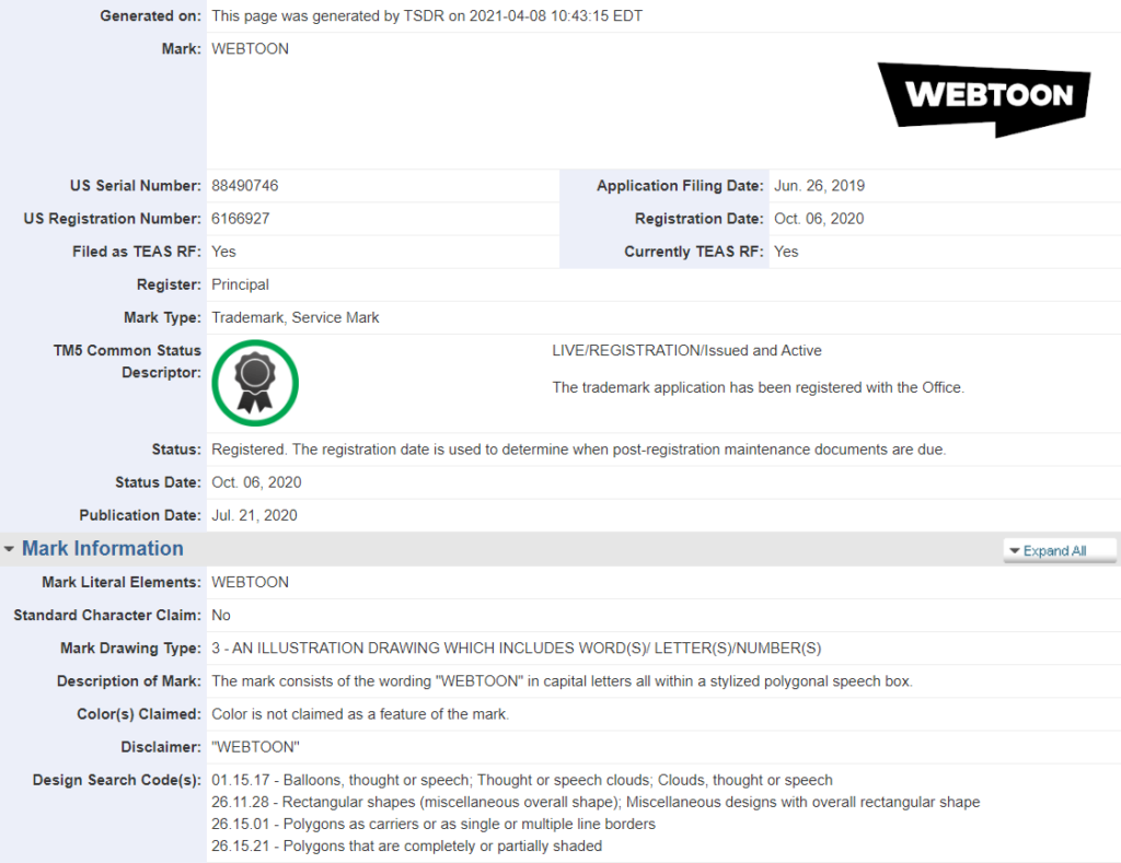 또한, 아래 세부 항목을 보면 Mark Information > Disclaimer 에 “WEBTOON” 이라고 명기되어 있는데요.